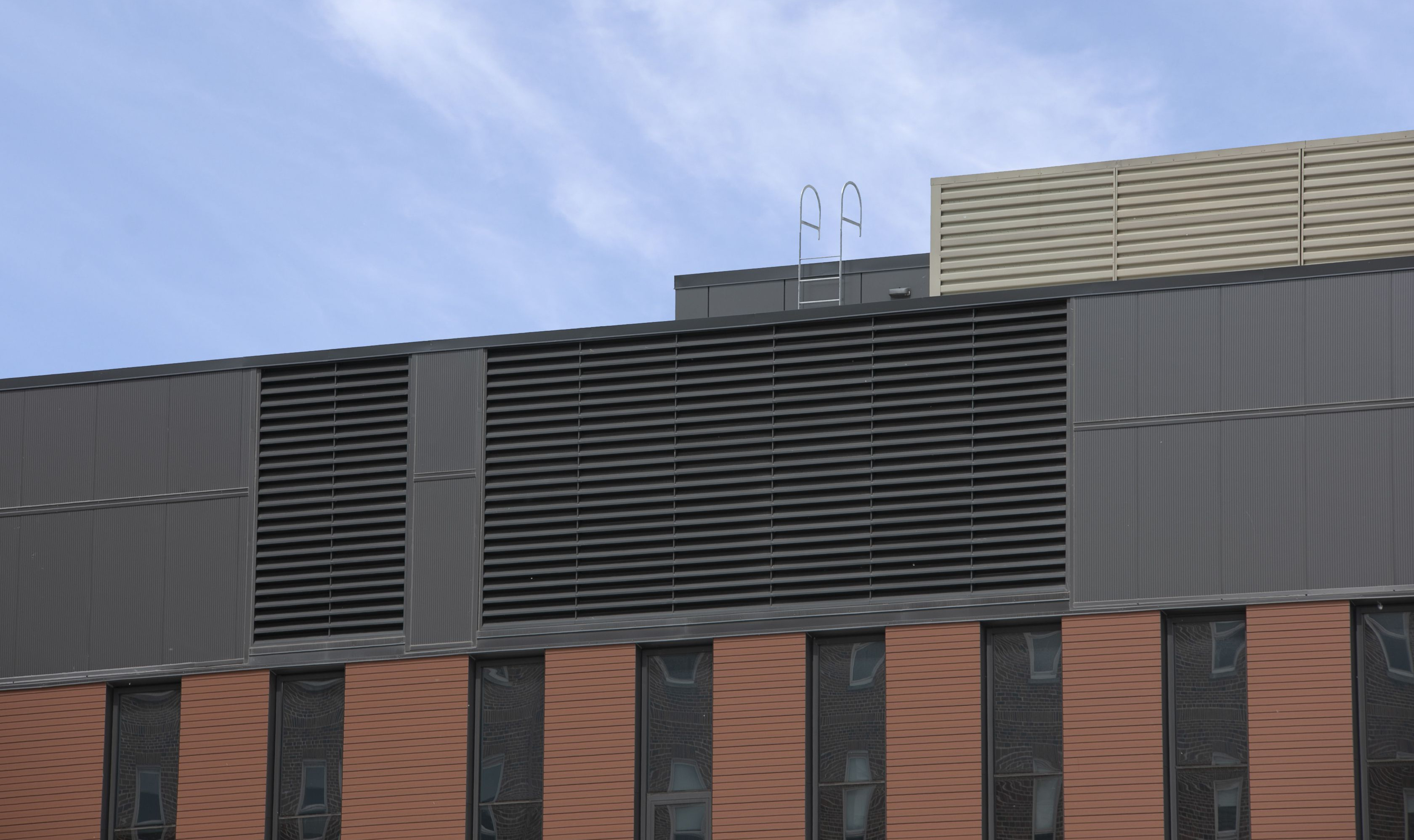 Manufacturing of geometrical and mechanical louvers for this pharmaceutical building.