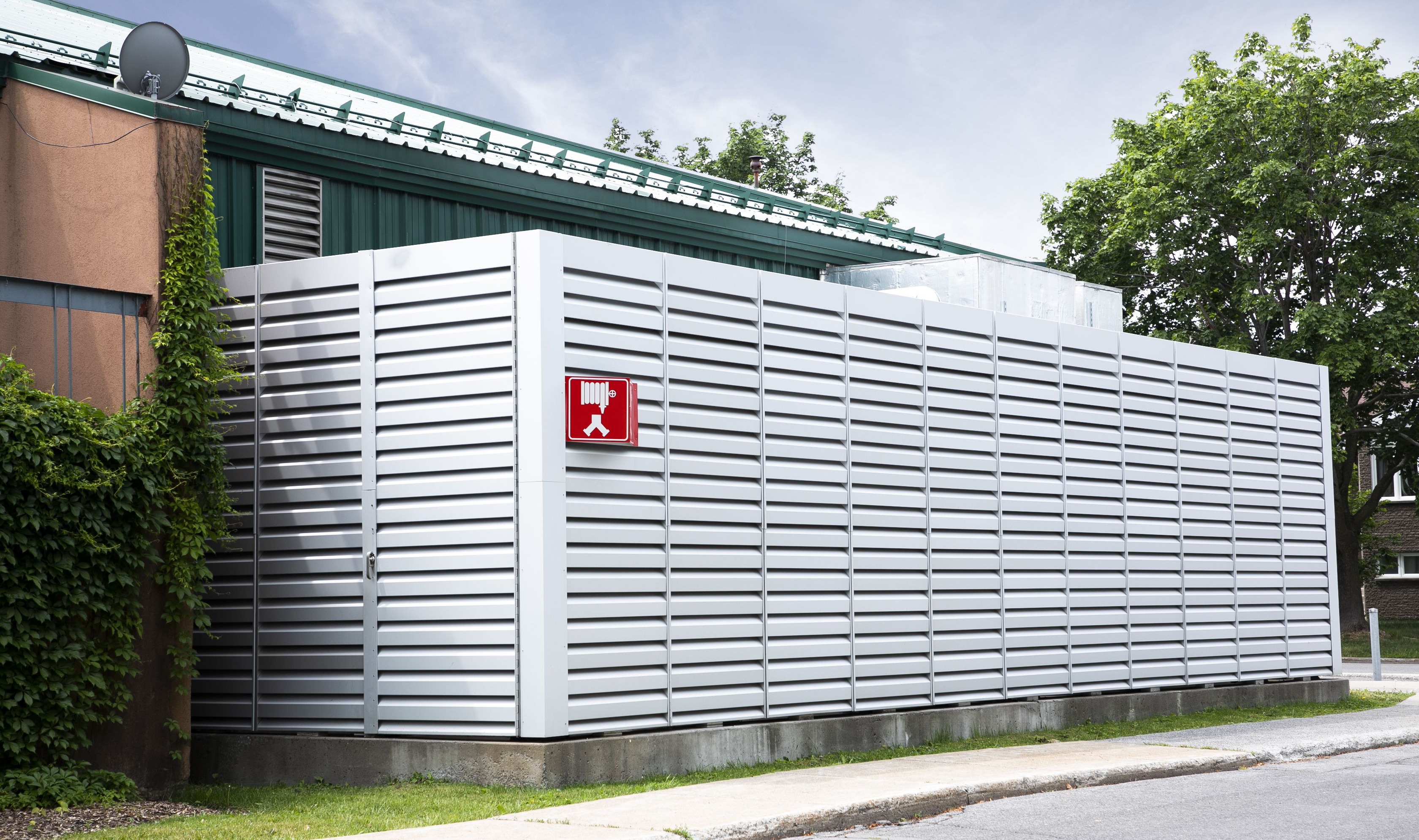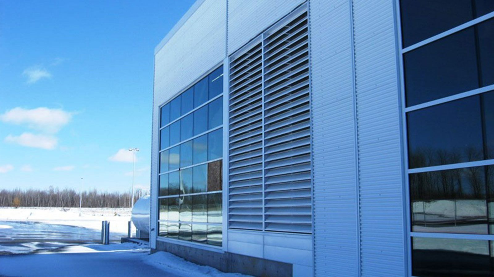 Continuous blade louvers and movable louver door to facilitate access to the Hydro-Quebec electrical equipments.